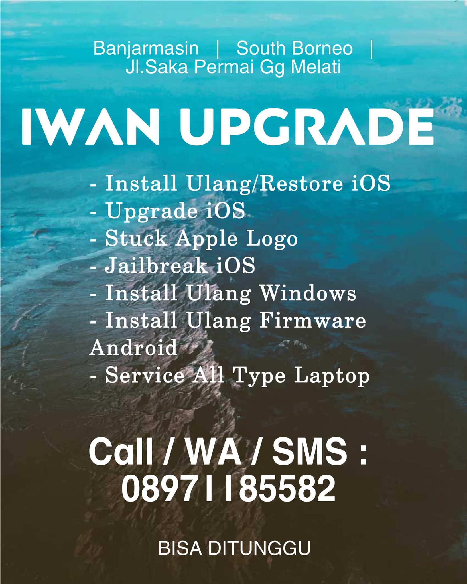 Install Ulang/Restore iOS, Upgrade iOS, Stuck Apple Logo, Jailbreak iOS, Install Ulang Windows, Install Ulang Firmware Android, Service All Type Laptop & PC.